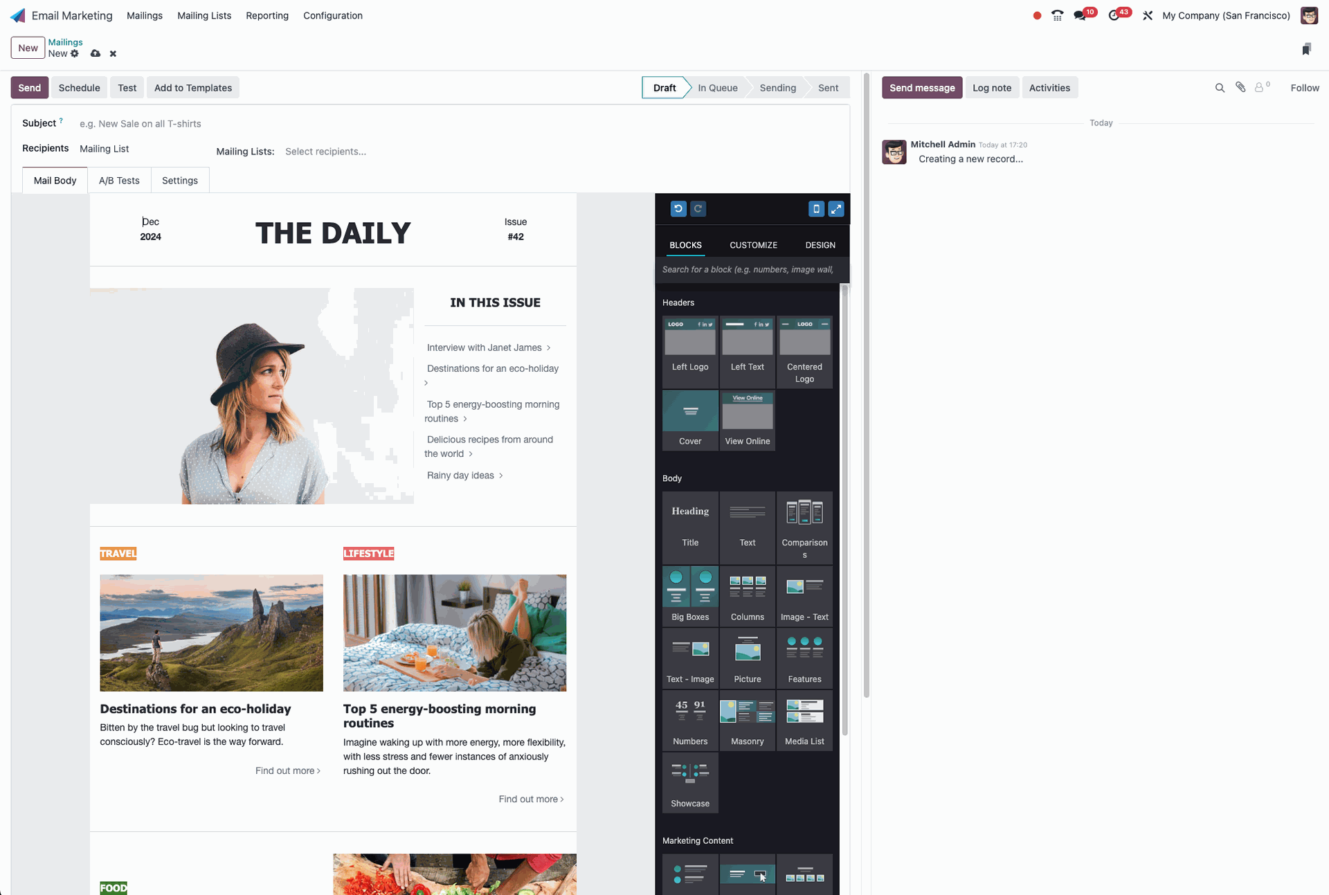 Met Odoo e-mailmarketing hoef je geen technisch expert te zijn. De intuïtieve drag-and-drop editor maakt het eenvoudig om professionele e-mails te ontwerpen.
