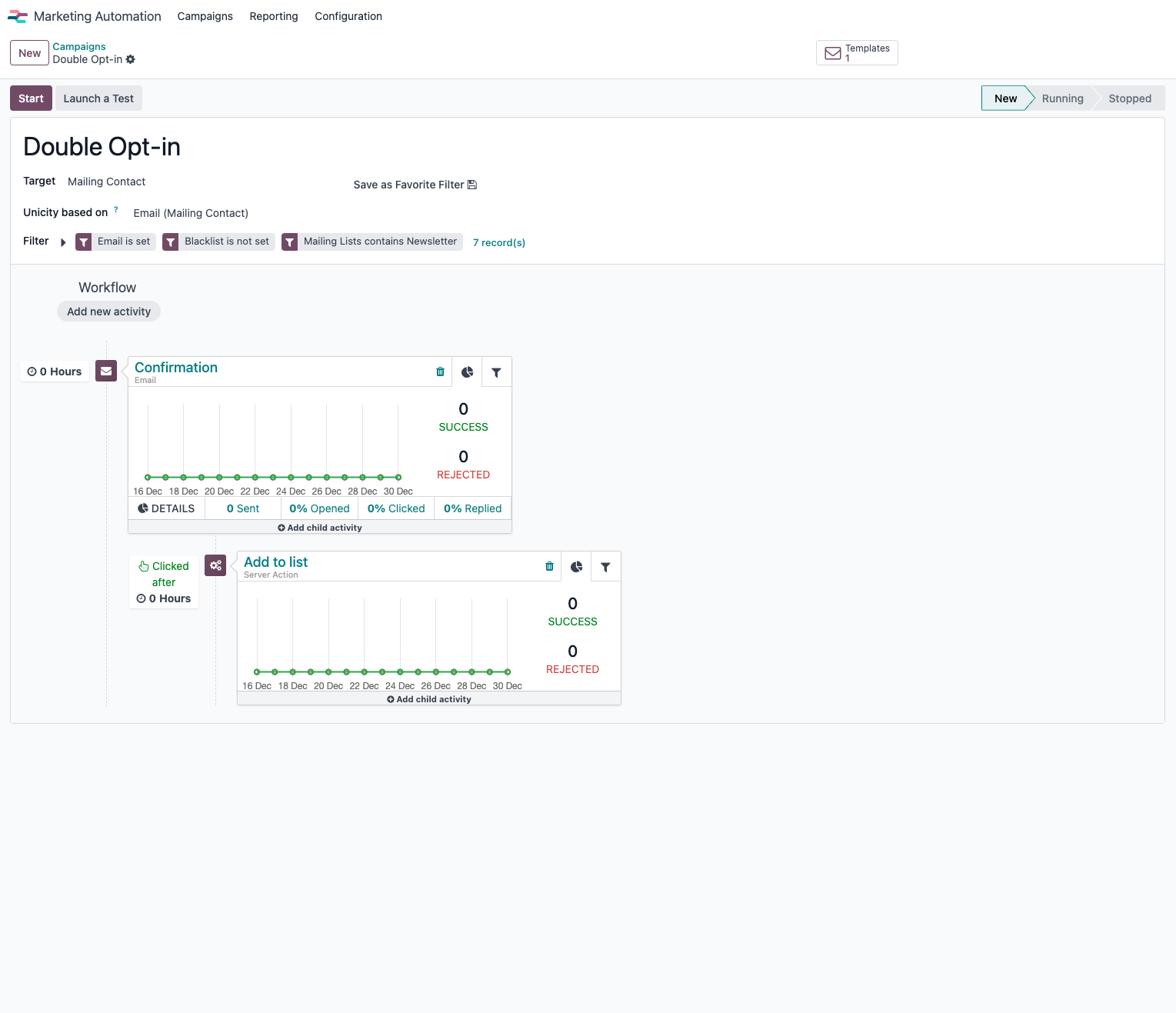 Odoo biedt real-time rapportages en A/B-testen om campagnes te analyseren en te optimaliseren. Zo krijg je inzicht in je prestaties en kiest Odoo de best presterende variant, zonder handmatige tussenkomst.