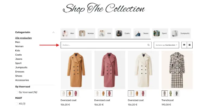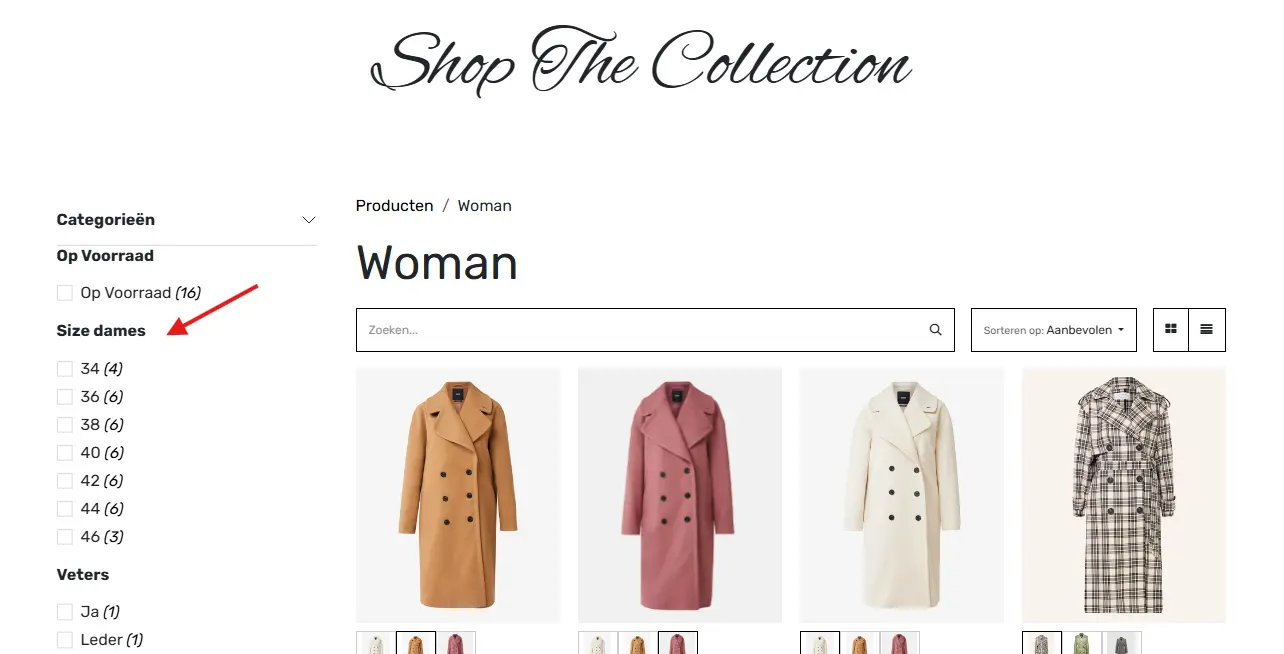 Geavanceerde filters waarmee bezoekers op basis van specifieke kenmerken (stijl, merk, prijs, etc.) kunnen verfijnen. Dit maakt het winkelen intuïtief en efficiënt, wat de kans op een aankoop verhoogt.