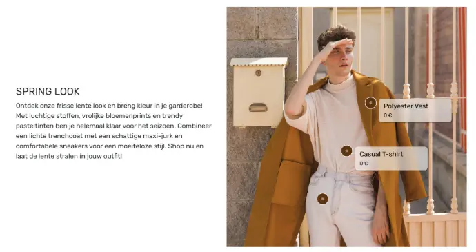Een inspirerende functie die klanten in staat stelt om direct een complete outfit of set uit een afbeelding aan hun winkelwagen toe te voegen. Dit verhoogt de gemiddelde bestelwaarde en stimuleert cross-selling.