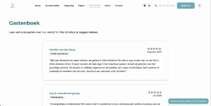 Een handige sectie voor testimonials, waar gasten hun ervaringen kunnen delen. Dit stelt potentiële huurders in staat om authentieke feedback te lezen, wat hen helpt bij het maken van een weloverwogen keuze.