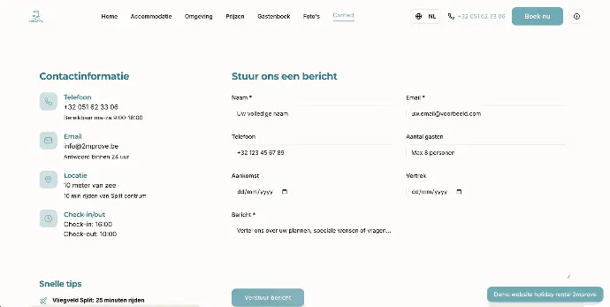 Via een contactformulier kunnen potentiële gasten contact met je opnemen om eenvoudig vragen te stellen en informatie op te vragen, waardoor het vertrouwen wordt versterkt.